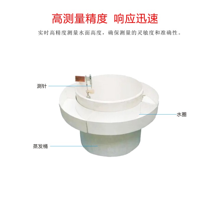 FY-E601B型水面蒸發(fā)由音響器、插座測針、蒸發(fā)桶、圍圈、橡皮管、溢流桶組成。用測針測得蒸發(fā)桶內的準確液位,某一規(guī)定時段內的液位差,即為該時段內的水面蒸發(fā)量。整個測針部件安裝在蒸發(fā)桶內插座孔上。旋轉刻度盤,則測針上下移動,使測針接觸水面。用游標讀數(shù)測得液位高度。針尖接觸水面前無音響信號,當針尖一觸水面,音響器電路產生振蕩,發(fā)出音響向工作者報以針尖觸水信號。