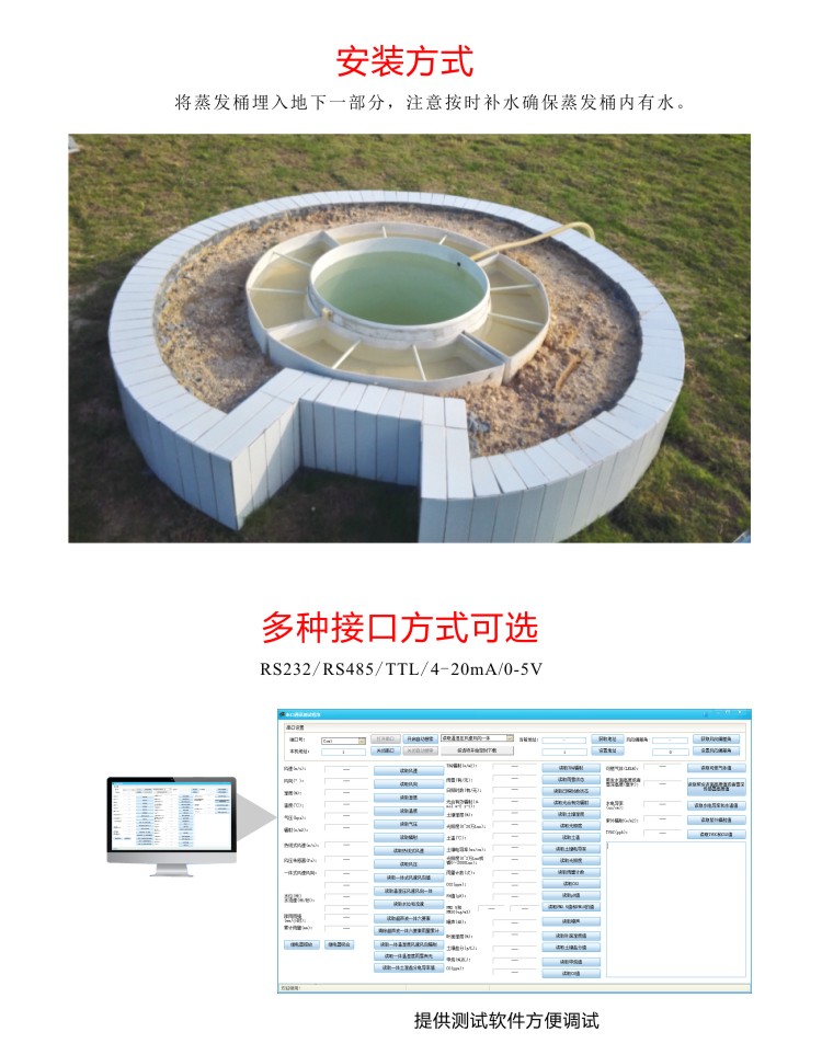 FY-E601B型水面蒸發(fā)器是蒸發(fā)站網上觀測水面蒸發(fā)量的儀器,水文、氣象部門均可使用。該產品具有防腐蝕、防凍裂、隔熱性好、防止小水體和地面劇烈的熱交換、測量精度高、使用方便、壽命長等優(yōu)點,被國家技術監(jiān)督局確定為全國水面蒸發(fā)觀測的唯一標準儀器并列入國標“GB11829-89”,被水利部、電力部、中國氣象局、中科院列為換代產品,在全國推廣使用。