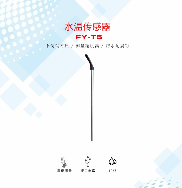 FY-T5水溫傳感器采用進口高精度溫敏器件,具有測量精度高、穩定性好等特點。本產品體積小巧,安裝方便,傳輸距離長,抗干擾能力強。可廣泛用于氣象、海洋、環境、機場、港口、實驗室、工農業及交通等領域的溫度測量。
