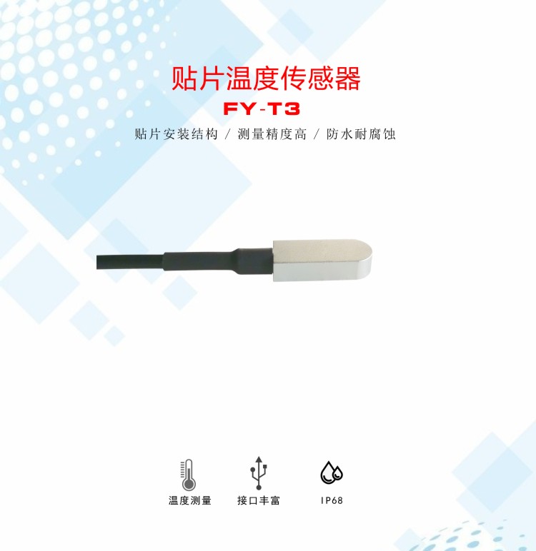 FY-T3貼片溫度傳感器主要用于測量物體表面的溫度,貼片式溫度傳感器通過螺釘、磁鐵或其它固定方式將傳感器貼在物體表面,實現(xiàn)較理想的測溫效果。貼片式溫度傳感器和被測物體接觸面積大,接觸緊密,所以在一些表面溫度測量方面具有比較明顯的優(yōu)勢。測溫準確性高、反應速度快,體積方便固定安裝。