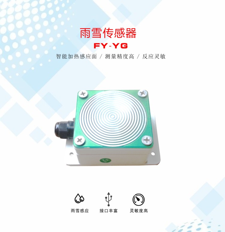 FY-YG雨雪感應(yīng)器采用表面柵形電極感應(yīng)外界雨雪情況,內(nèi)部采用進(jìn)口智能微處理器,反應(yīng)靈敏、測量精度高。內(nèi)置自動(dòng)加熱裝置可排除雨雪附著的干擾,保障系統(tǒng)的正常運(yùn)行。輸出為開關(guān)信號,方便安裝使用。本產(chǎn)品可廣泛用于氣象、海洋、環(huán)境、機(jī)場、港口、實(shí)驗(yàn)室、工農(nóng)業(yè)及交通等領(lǐng)域的雨雪有無定性測量。
