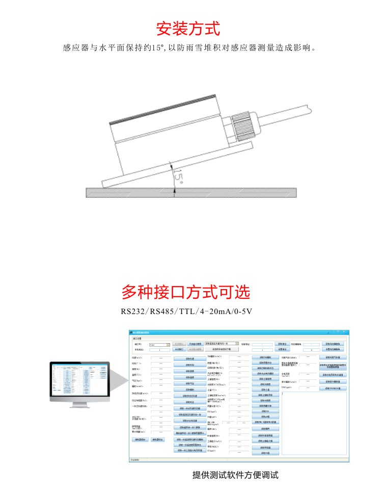 1、如圖所示,將2個(gè)M3×25螺絲穿過感應(yīng)器前端的兩個(gè)安裝孔2個(gè)M3×35螺絲穿過感應(yīng)器后端的兩個(gè)安裝孔,使感應(yīng)器感應(yīng)面與水平面保持約15°(以防雨、雪的堆積對感應(yīng)器測量造成影響),將感應(yīng)器固定在安裝座上;