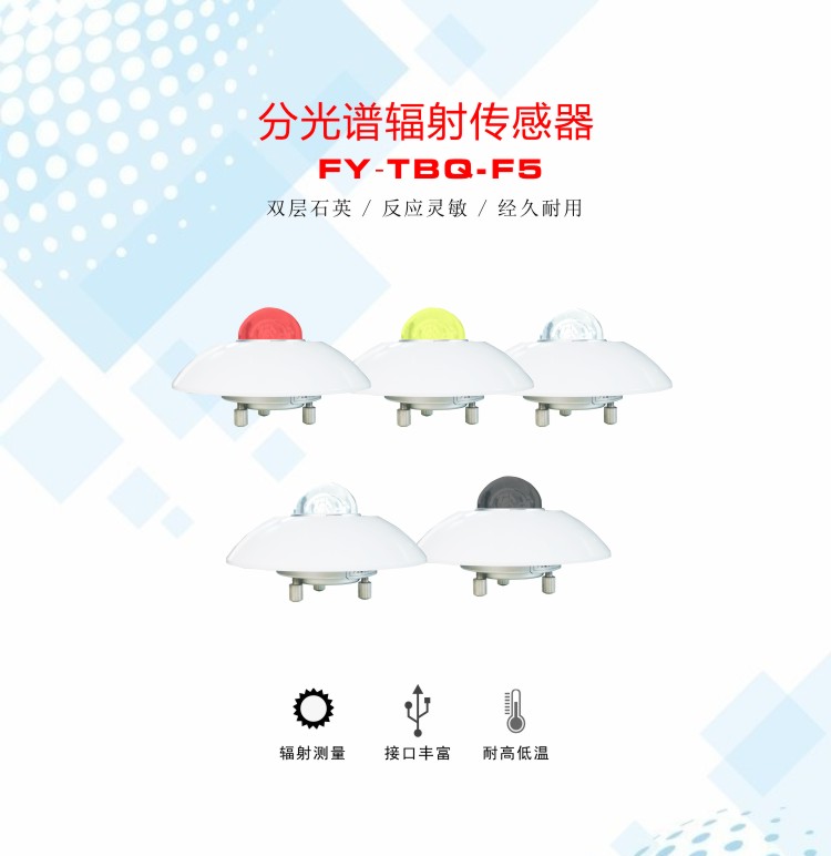 FY-TBQ-F5分光譜輻射表可選擇WB280、JB400、CB500、RB600、HB700五種濾光罩,組合使用測量出總輻射、紫外、可見光、紅外輻射。應用于紫外線預報、農(nóng)業(yè)氣象、植物生理研究、太陽能利用、海洋考察、建筑材料老化及大氣污染等領域。分光譜輻射表可廣泛應用于紫外線強度預報、農(nóng)業(yè)氣象、植物生理研究、太陽能利用、海洋考察、建筑材料老化及大氣污染等科學研究。