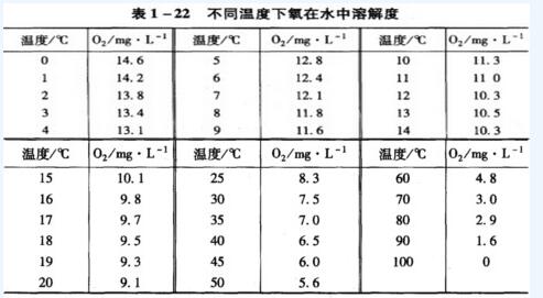 地表水中溶解氧的含量與水溫、氣壓及水中有機物含量有關。表1—22給出了在水中不含有機物的情況下,O.1MPa大氣壓及不同溫度時,空氣中的氧在水中的溶解度。