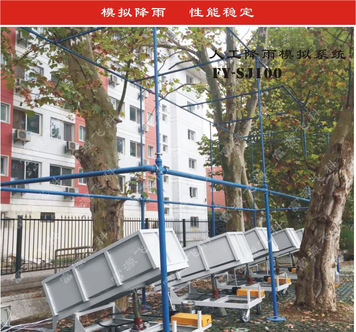 FY-SJ100型人工降雨模擬系統與自然降雨物理性能相似,采用旋轉下噴式噴頭模擬降雨,水泵采用可控的變頻潛水泵,可任意調節水泵的功率,從而可以實現雨量大小的調節,同時在主管路上安裝有壓力傳感器,可實時的反映主水路的壓力情況,可做到閉環自動控制雨強大小。