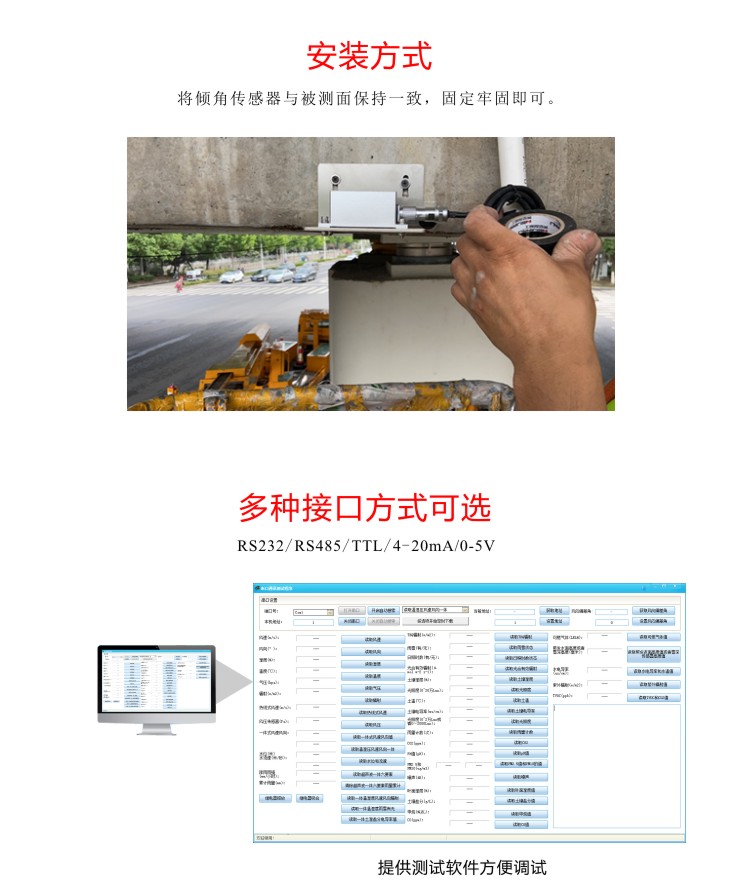 FY-ZQA雙軸高精度數字型傾斜傳感器。RS485輸出,含總線通訊協議,支持多個傾角組網。測角范圍±30度,高分辨率,具有響應頻率可調整; 波特率從(2400-38400bps)可調等功能。在工程上,將測量槽管埋入地下,當基坑、邊坡、地基產生形變時,使用該儀器測量測斜槽管的變形,將測斜探頭埋入地下,從而可精確測出水平位移量ΔX,Y。根據ΔX,Y的值大小,作出預報,指導施工。