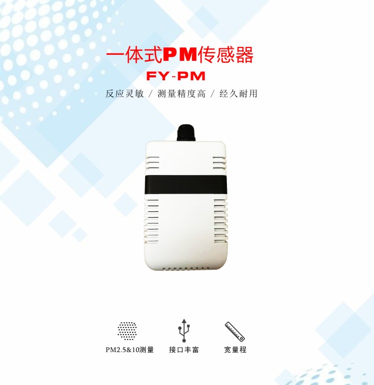FY-PM一體式PM傳感器可監測小到0.03um的顆粒,相對準確的反映當地的PM2.5和PM10的值。測量范圍可以達到0-1000μg/m3,可準確可靠的在線監測空氣中塵埃粒子動態,具有操作簡單,反應靈敏度高等特點。