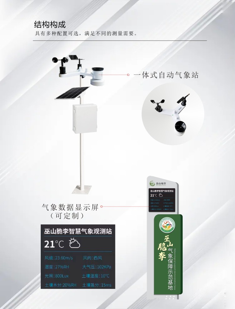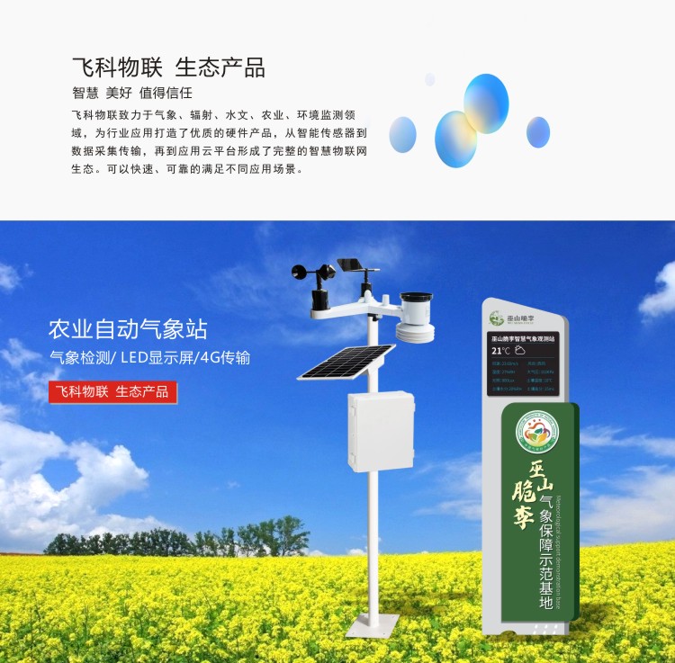 FY-FARM200系列農(nóng)業(yè)氣象站,可對(duì)風(fēng)速、風(fēng)向、溫度、濕度、氣壓、雨量、光照、輻射、土壤溫濕度、鹽分、電導(dǎo)率、PM2.5等進(jìn)行同步測(cè)量。采用進(jìn)口傳感元件作為感應(yīng)部件,具有測(cè)量精度高、穩(wěn)定性好等特點(diǎn),傳感器采用先進(jìn)的電路集成模塊,可根據(jù)用戶的不同需求輸出RS232、RS485、4G等通訊方式傳輸。儀器體積小巧,安裝方便且便攜,性能可靠;可廣泛應(yīng)用于氣象觀測(cè)、環(huán)境控制、農(nóng)業(yè)、工廠等諸多領(lǐng)域。