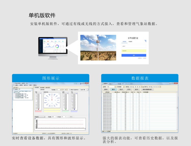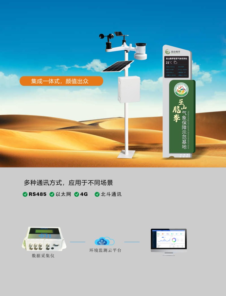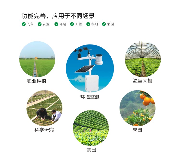 ●測(cè)量風(fēng)速、風(fēng)向、溫度、濕度、氣壓、雨量、光照、輻射、土壤溫濕度、鹽分、電導(dǎo)率、PM2.5等;