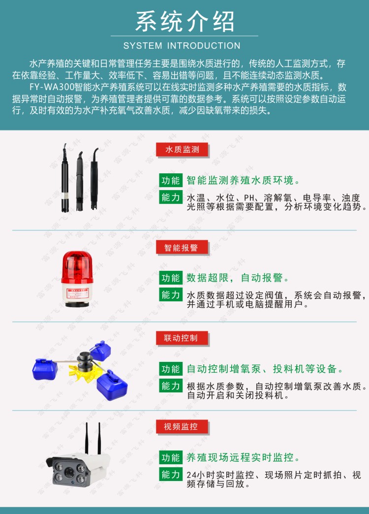 FY-WA300智能水產(chǎn)養(yǎng)殖系統(tǒng)可以在線實(shí)時(shí)監(jiān)測(cè)多種水產(chǎn)養(yǎng)殖需要的水質(zhì)指標(biāo),數(shù)據(jù)異常時(shí)自動(dòng)報(bào)警,為養(yǎng)殖管理者提供可靠的數(shù)據(jù)參考。系統(tǒng)可以按照設(shè)定參數(shù)自動(dòng)運(yùn)行,及時(shí)有效的為水產(chǎn)補(bǔ)充氧氣改善水質(zhì),減少因缺氧帶來的損失。