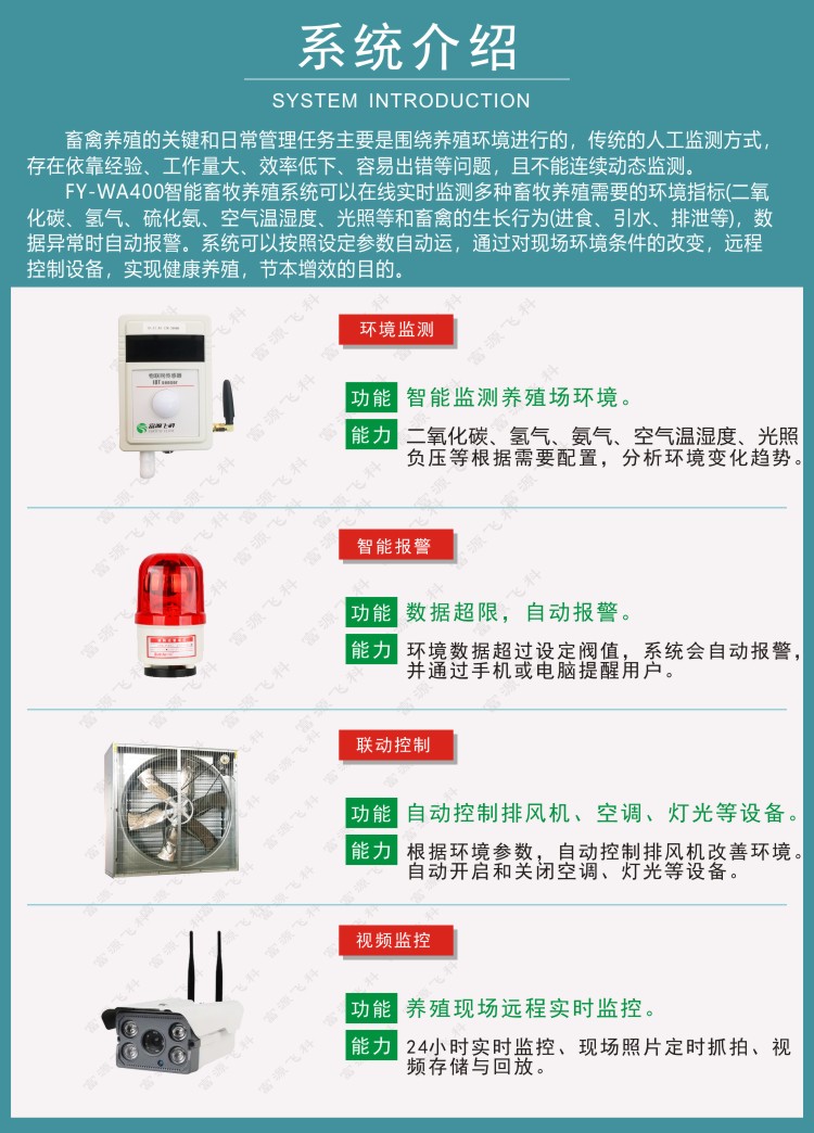 FY-WA400智能畜牧養(yǎng)殖系統(tǒng)可以在線實時監(jiān)測多種畜牧養(yǎng)殖需要的環(huán)境指標(biāo)(二氧化碳、氫氣、硫化氨、空氣溫濕度、光照等和畜禽的生長行為(進(jìn)食、引水、排泄等),數(shù)據(jù)異常時自動報警。系統(tǒng)可以按照設(shè)定參數(shù)自動運,通過對現(xiàn)場環(huán)境條件的改變,遠(yuǎn)程控制設(shè)備,實現(xiàn)健康養(yǎng)殖,節(jié)本增效的目的。