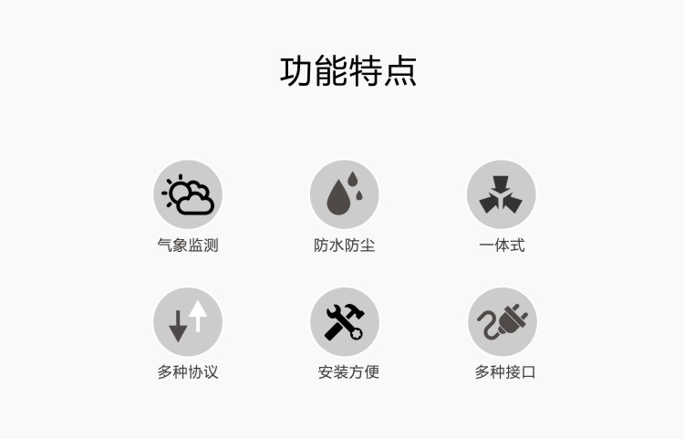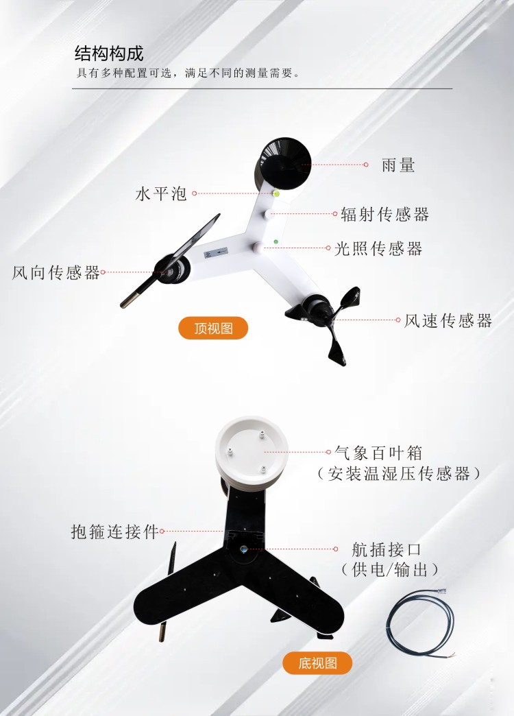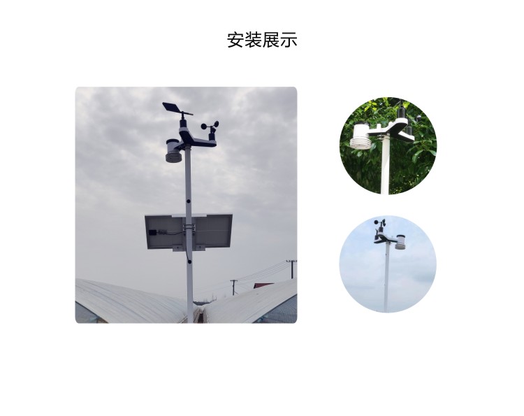 ●測量風速、風向、溫度、濕度、氣壓、雨量、光照、紫外、輻射、PM2.5、PM10、噪聲等;
