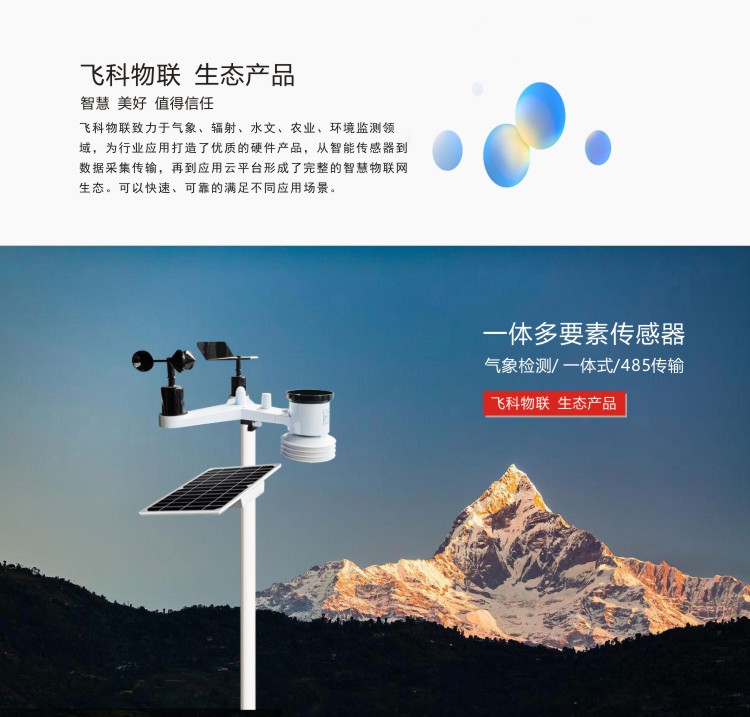 FY-QG系列一體式多要素傳感器,可對風速、風向、溫度、濕度、氣壓、雨量、光照、紫外、輻射、PM2.5、PM10、噪聲等進行同步測量。采用進口傳感元件作為感應部件,具有測量精度高、穩定性好等特點,傳感器采用先進的電路集成模塊,可根據用戶的不同需求輸出RS232、RS485、4G等通訊方式傳輸。儀器體積小巧,安裝方便且便攜,性能可靠;可廣泛應用于氣象觀測、環境控制、農業、工廠等諸多領域。