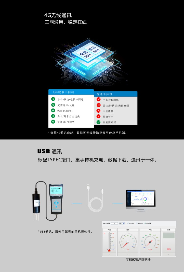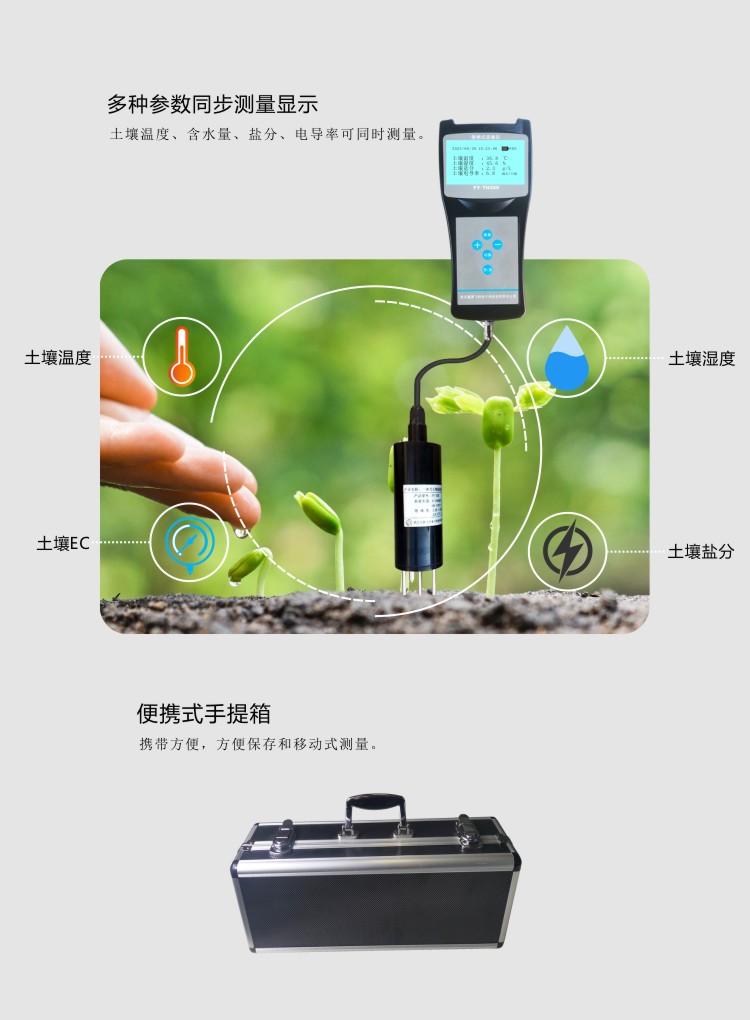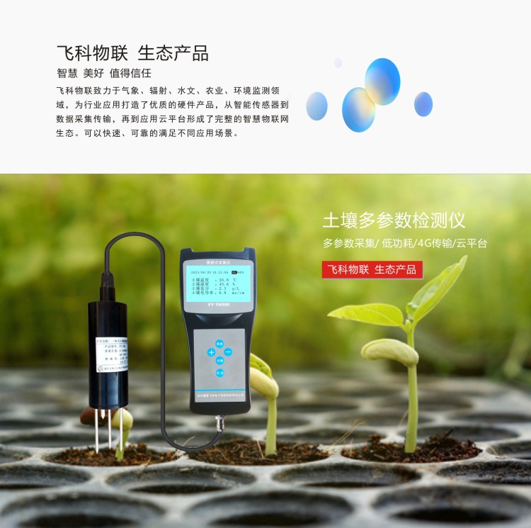 FY-TH300A土壤多參數檢測儀是一款攜帶方便,操作簡單的便攜式土壤檢測設備。低功耗大屏液晶,可同時顯示土壤溫度、土壤水分、土壤鹽分、土壤電導率等,內置大容量FLASH存儲芯片可存儲4萬條歷史數據;通用USB通訊接口,使用配套的USB線纜即可將數據下載到電腦,也可通過4G將數據傳輸至云平臺,方便用戶對氣象數據的進一步處理分析。