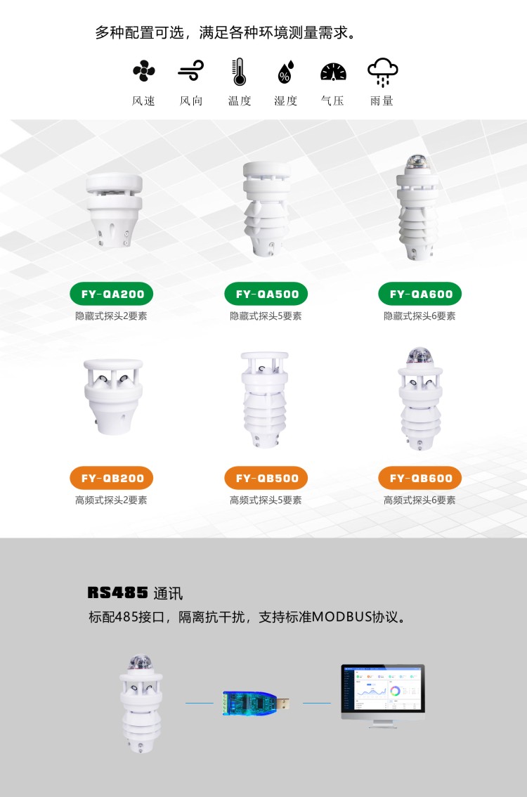 FY-QB600超聲波6要素傳感器采用超聲波原理,一體式結構可對風速、風向、溫度、濕度、氣壓、雨量等進行同步測量。采用高精度傳感元件作為感應部件,具有測量精度高、穩定性好等特點,傳感器采用先進的電路集成模塊,可根據用戶的不同需求輸出RS232、RS485、4G等通訊方式傳輸。儀器體積小巧,安裝方便且便攜,性能可靠;可廣泛應用于氣象觀測、環境控制、農業、工廠等諸多領域。