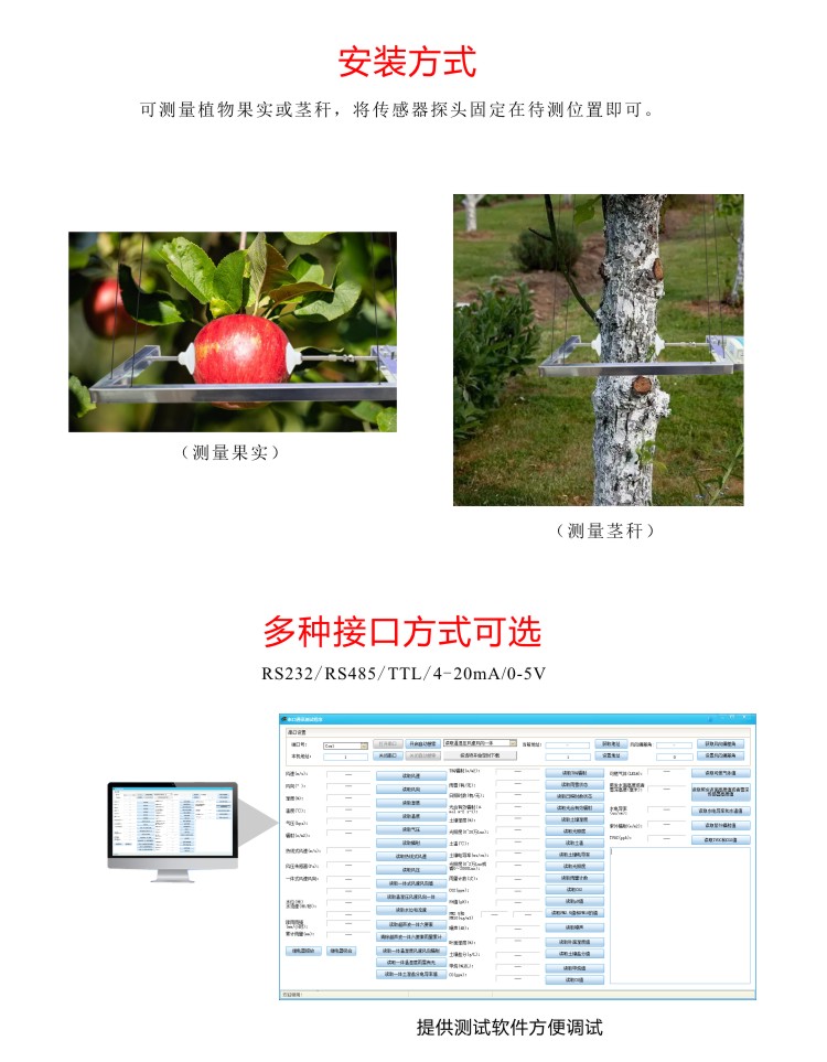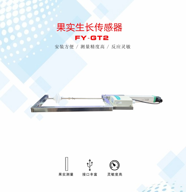 FY-GT2果實生長傳感器是一種高精度位移增量傳感器,測量原理為利用高精度的位移傳感器移動的距離來測量植物果實或植物莖稈的生長變化長度。可記錄水果或者植物莖稈整個生長周期的大小變化。