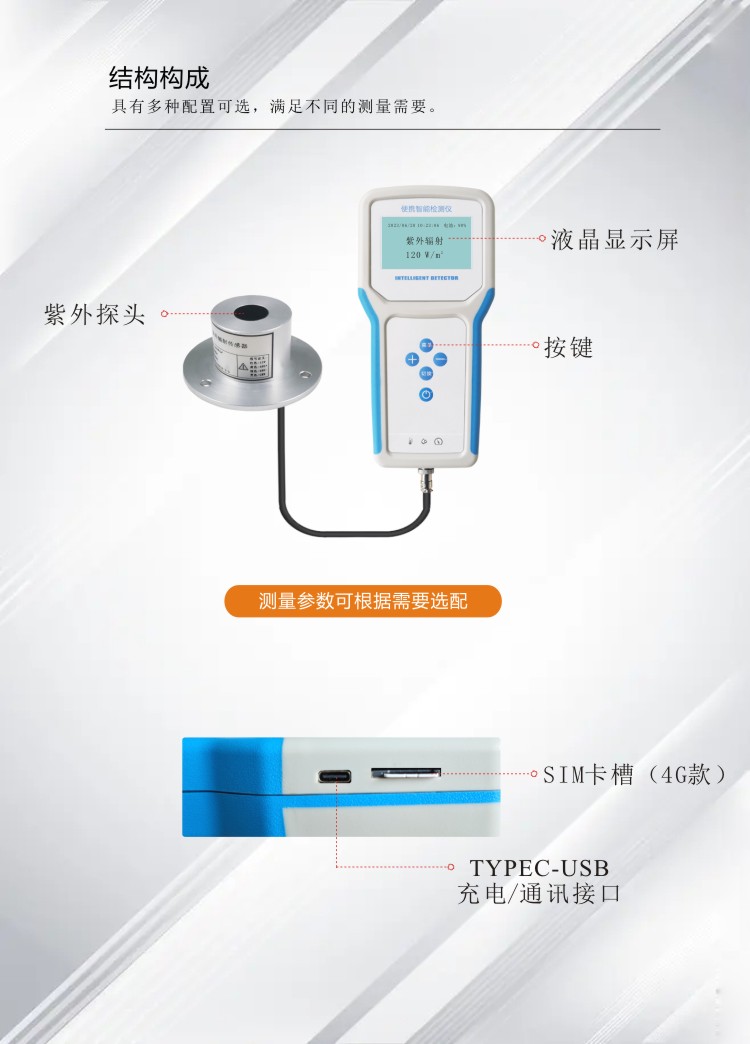 FY-TH300紫外輻射檢測儀是一款攜帶方便,操作簡單的便攜式環境檢測設備。低功耗大屏液晶時顯示紫外輻射值,可測量UVAB光譜范圍范圍內紫外線強度。內置大容量FLASH存儲芯片可存儲4萬條歷史數據;通用USB通訊接口,使用配套的USB線纜即可將數據下載到電腦,也可通過4G將數據傳輸至云平臺,方便用戶對氣象數據的進一步處理分析。